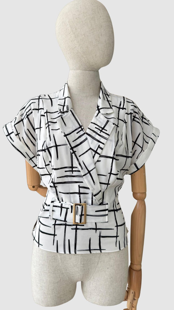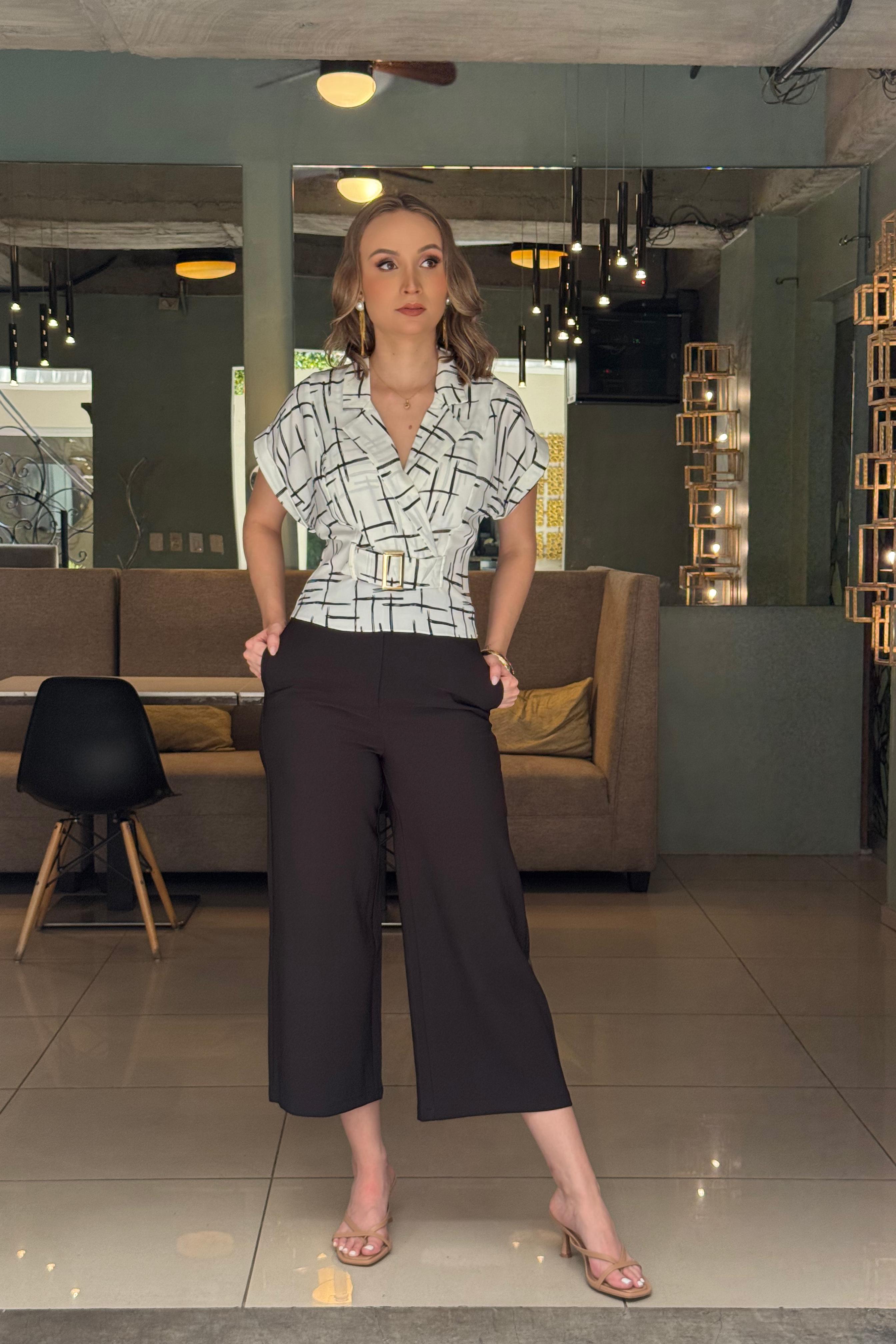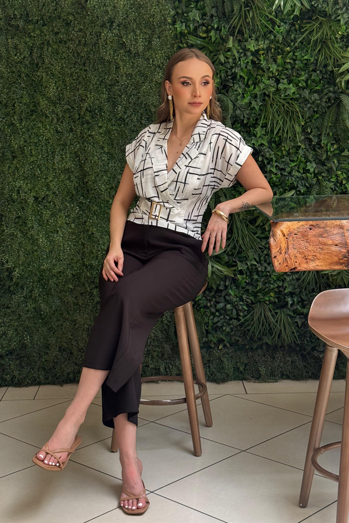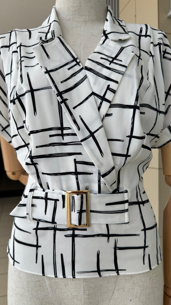 BLANCO ESTAMPADO CON NEGRO FAJA - S está en espera y se enviará tan pronto como vuelva a estar en stock