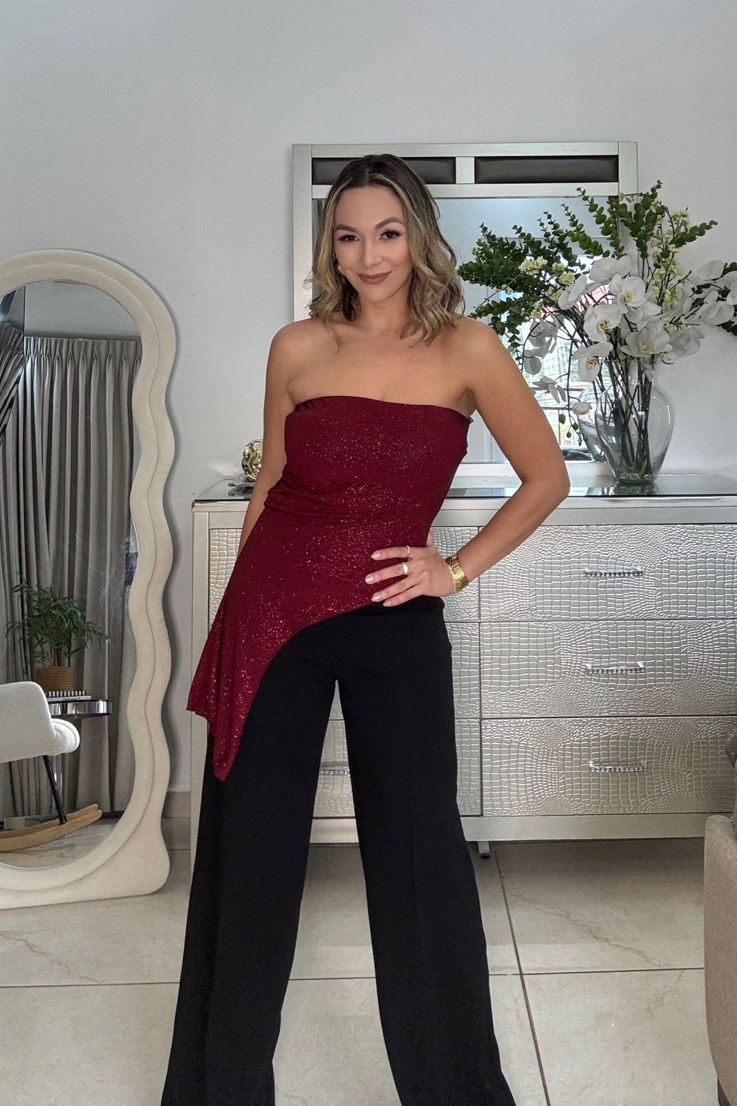 BURGUNDY TOP BRILLOS STRAPLESS ASIMETRICO - S está en espera y se enviará tan pronto como vuelva a estar en stock