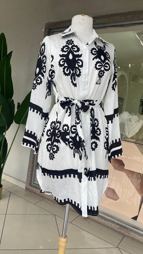 BLANCO CAMISERO VESTIDO CORTO ESTAMPADO TRIBAL MANGA LARGA