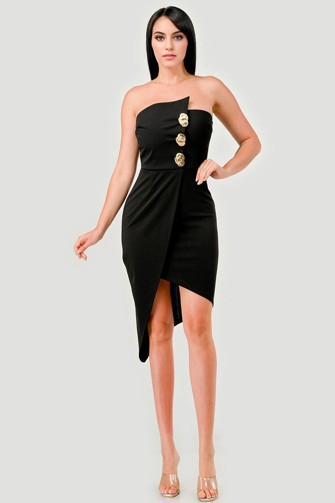 NEGRO STRAPLESS MIDI TUBO BOTONES DORADOS